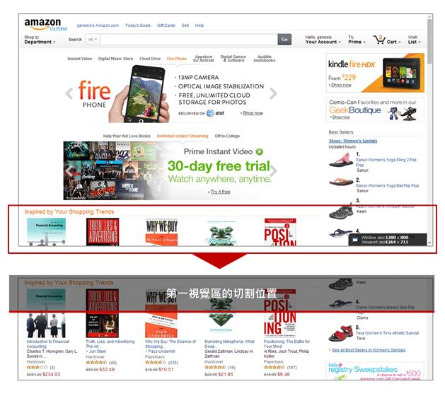 以Amazon網(wǎng)站首頁(yè)為例,無(wú)論以1024 x 768或1280 x 800等解析度瀏覽網(wǎng)站,第一視覺(jué)區(qū)中滿(mǎn)足了上述四個(gè)元素,放置了最重要的資訊、圖片,并讓使用者感覺(jué)網(wǎng)頁(yè)下方還有內(nèi)容,增加往下瀏覽的意愿。