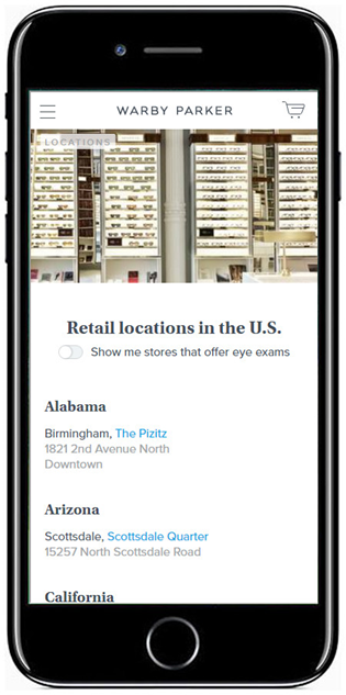 Warby Parker非常了解自己的客戶,將網(wǎng)站的地址頁針對移動端進行了優(yōu)化。點擊進入具體地址的著陸頁會看到聯(lián)系信息、交互式地圖、照片以及位置說明。