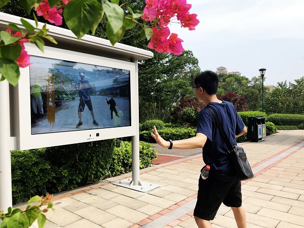 接下來我們?nèi)ンw驗(yàn)?zāi)抢锏腁R太極,AR太極是傳統(tǒng)的太極與AI和AR技術(shù)相結(jié)合,實(shí)現(xiàn)面對(duì)面實(shí)時(shí)的虛擬教學(xué)。參與者只需要按照智能大屏提示舉起右手,通過人工智能領(lǐng)域人體肢體識(shí)別技術(shù)判斷后自動(dòng)開啟互動(dòng)。過程中會(huì)自動(dòng)識(shí)別并計(jì)算參與者動(dòng)作并給與相應(yīng)分?jǐn)?shù),無論您會(huì)不會(huì)太極拳,跟著這位“太極大師”都能打得很好。AR太極將會(huì)給您帶來無限的運(yùn)動(dòng)樂趣。