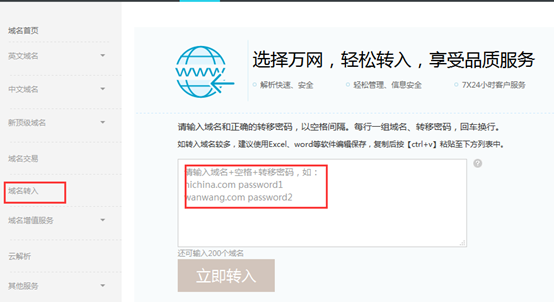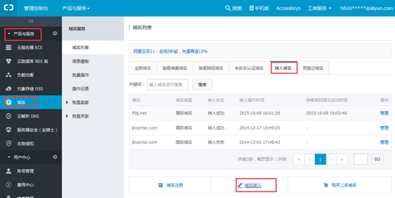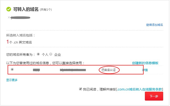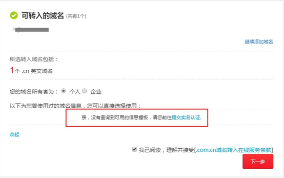 5、登錄阿里云/萬(wàn)網(wǎng)【管理控制臺(tái)】- 【域名】- 進(jìn)入【域名轉(zhuǎn)入】- 填寫(xiě)需轉(zhuǎn)入域名(包括后綴)和域名轉(zhuǎn)入密碼,域名轉(zhuǎn)入需符合規(guī)則 - 選擇一個(gè)【已實(shí)名認(rèn)證】的信息模板,點(diǎn)擊【下一步】,提交訂單、立即結(jié)算 - 按照流程指引完成即可。如下圖所示: