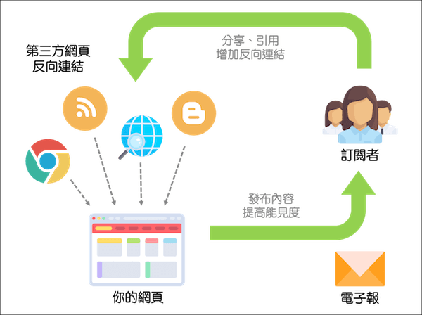 增加反向鏈接:反向鏈接指的是由其他人的網(wǎng)站連到你的網(wǎng)頁(yè)的鏈接,反向鏈接的多寡,對(duì)SEO 成效有顯著影響,若有來自排序更高或者更多元網(wǎng)站的外部鏈接連向你的網(wǎng)頁(yè),你的網(wǎng)站也會(huì)得到越高的SEO 排位。經(jīng)由電子郵件將最新或者整理過后的網(wǎng)站內(nèi)容,發(fā)送給有興趣的訂閱者,若他們透過自己的網(wǎng)站、博客或社交媒體分享或引用你的網(wǎng)站,就能提高你的網(wǎng)頁(yè)能見度,并增加反向鏈接的數(shù)量。