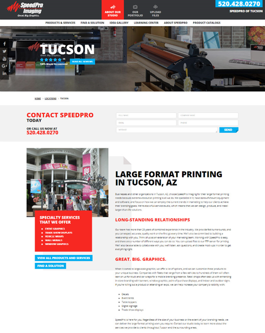 比如,點擊Tucson(圖森)之后,你會進入一個介紹這個地點的特色服務的頁面--貼花、帳篷、桌墊、展覽陳列等等,當然還包括該店鋪的團隊信息。